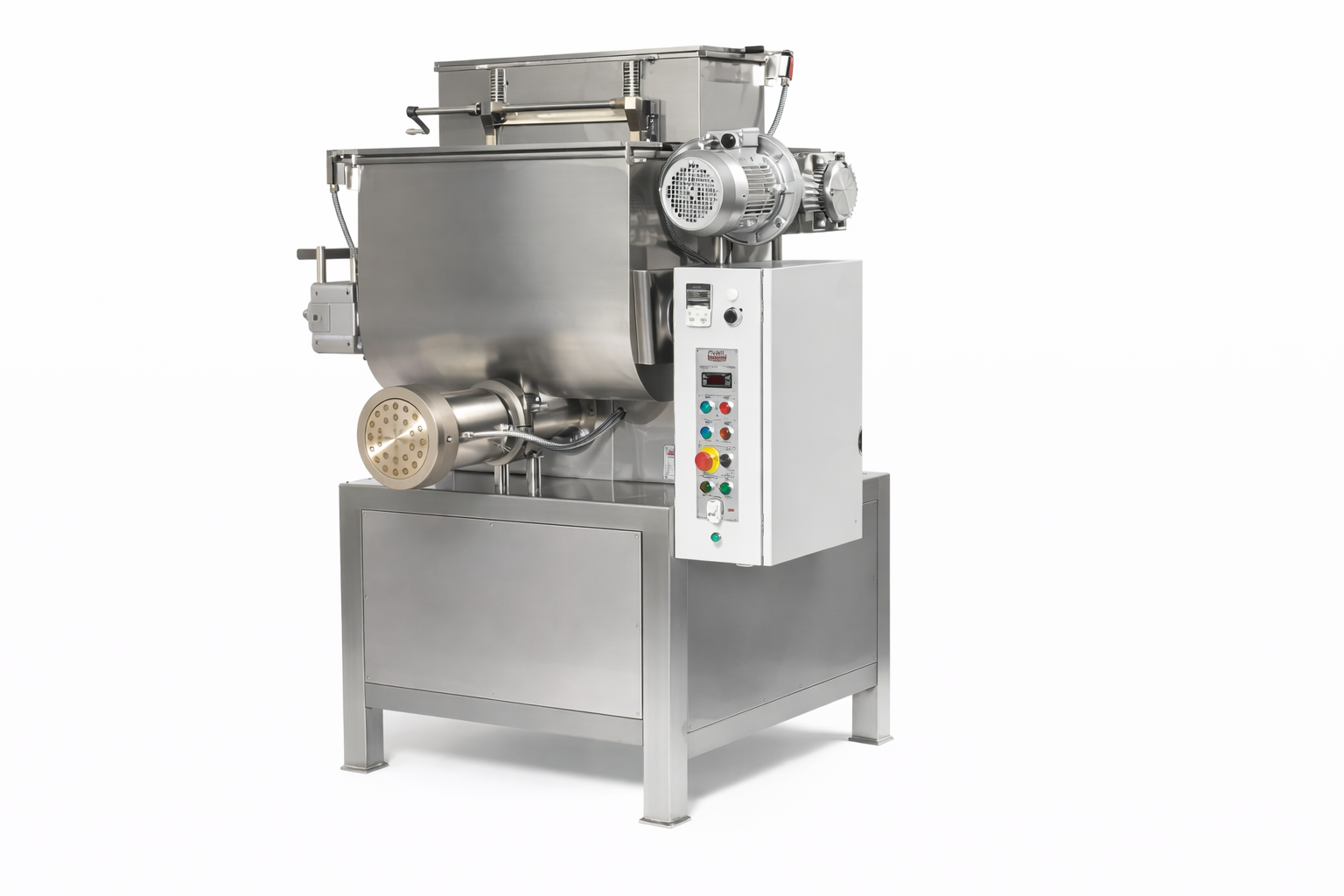 Industrial pasta extruder machine, powerful for automatic pasta lines for lasagne-cannelloni, ravioli, and tagliatelle, as well as short pasta production by changing bronze dies. Adjacent basins allow automatic passage of mixture from mixing to feeder basin.
